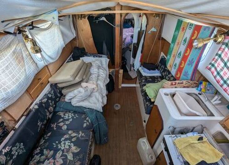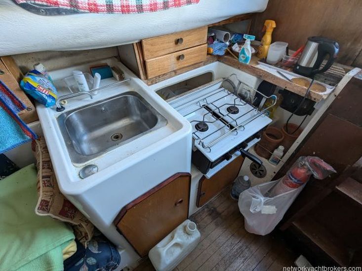 Moving aft, there is a separate Head's compartment equipped with a marine toilet and a wash basin supplied with manually pumped cold water.